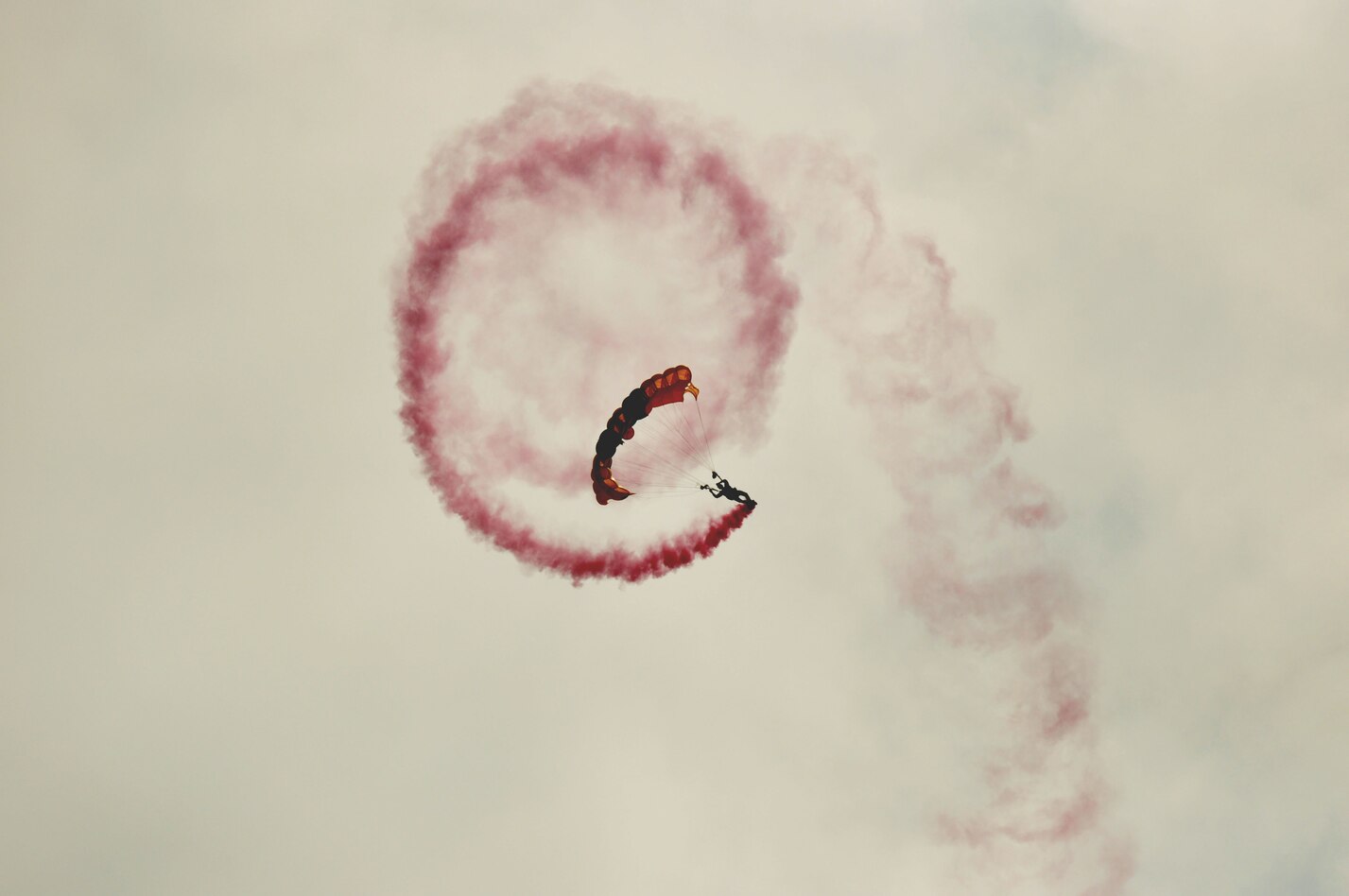 A Golden Knight spirals downward in a controlled aerial maneuver at the Air Power over Hampton Roads open house at Langley Air Force Base, Va., May 14, 2011. The Golden Knights have been wowing audiences at air shows, competitions, and high profile tandems for 50 years. (U.S. Air Force photo by Senior Airman Jonathan Muller)(RELEASED)
