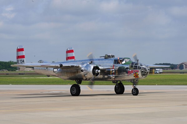 A B-25 Panchito taxis in after an aerial demonstration during the AirPower over Hampton Roads open house at Langley Air Force Base, Va., May 15, 2011. The open house gives military and civilian personnel the opportunity to get up-close-and-personal with various aircraft and witness the Air Force’s past and present capabilities in airpower. (U.S. Air Force photo by Staff Sgt. Ashley Hawkins)(RELEASED)