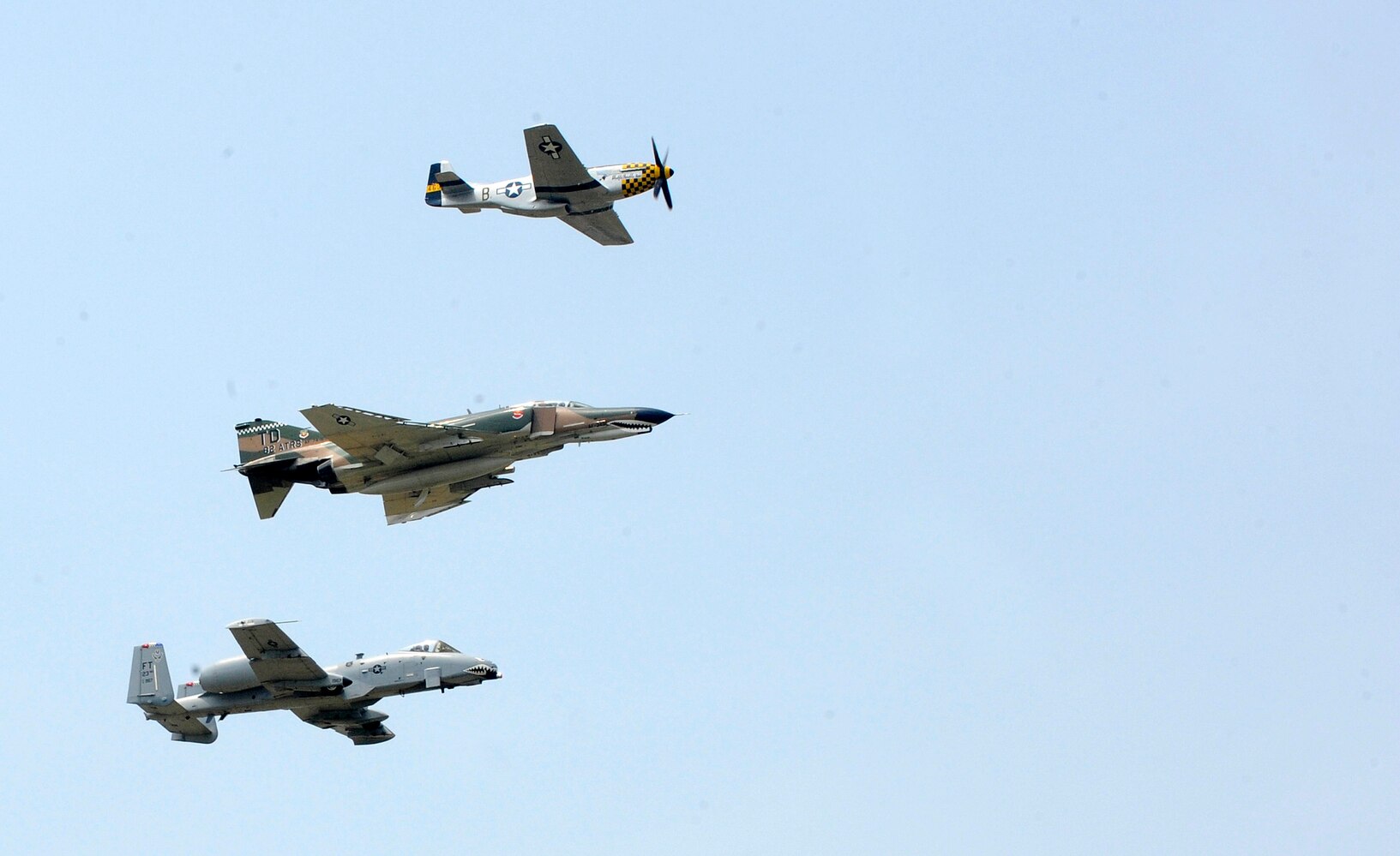 The Air Force Heritage Flight performs a fly by during the AirPower over Hampton Roads open house at Langley Air Force Base, Va., May 14, 2011. The U.S. Air Force Heritage Flight program presents the evolution of U.S. Air Force air power by flying today's state-of-the-art fighter aircraft in close formation with vintage fighter aircraft. (U.S. Air Force photo by Staff Sgt. Dana Hill)(RELEASED)