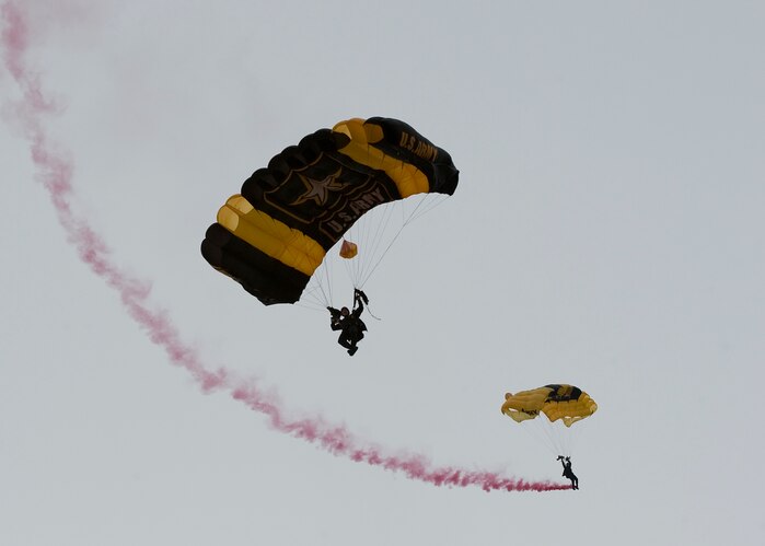 Members of the U.S. Army Parachute Team Golden Knights perform during the "Airpower over Hampton Roads" Open House at Langley Air Force Base, Va., May 13, 2011. The open house helps to educate the public on past and present Air Force aerial capabilities, increase recruiting and show appreciation to the local community. (U.S. Air Force photo/Senior Airman Zachary Wolf)(RELEASED)