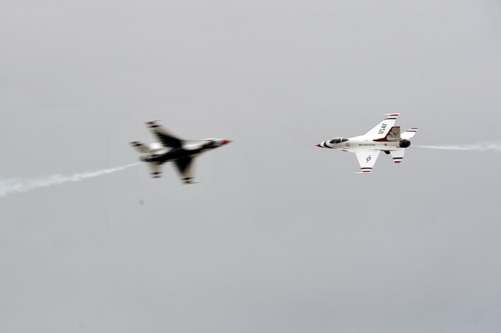 The U.S. Air Force Air Demonstration Squadron, Thunderbirds, perform precision aerial maneuvers during the “AirPower over Hampton Roads” Open House at Langley Air Force Base, Va., May 13, 2011. U.S. Air Force Thunderbirds headlined the open house, demonstrating the capabilities of high-performance aircraft to the Hampton Roads area. (U.S. Air Force photo by Airman 1st Class Camilla Griffin/RELEASED)