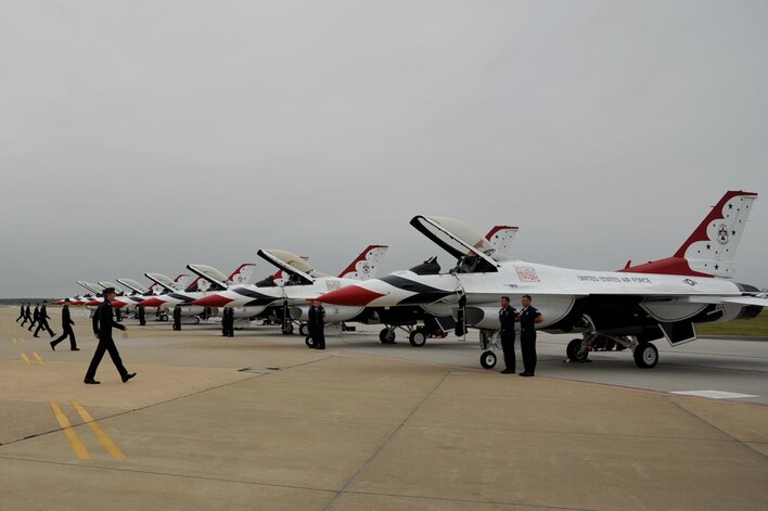 The U.S. Air Force Air Demonstration Squadron, Thunderbirds, pilots approach their F-16 Fighting Falcons prior to a performance during the AirPower over Hampton Roads open house at Langley Air Force Base, Va., May 13, 2011. Thunderbirds headlined the open house and performed precision aerial maneuvers, demonstrating the capabilities of high-performance aircraft to the Hampton Roads area. (U.S. Air Force photo by Airman 1st Class Camilla Griffin/RELEASED)