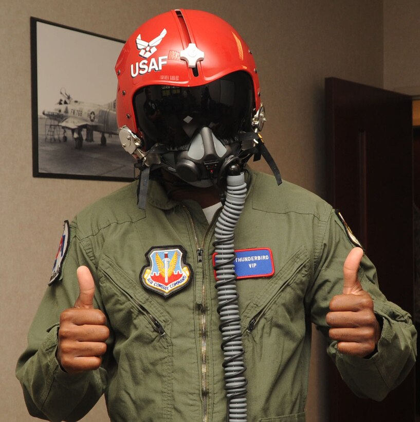 Mr. Travis Daniels, emergency medical technician, gives the thumbs up while being issued his flight gear at Langley Air Force Base, Va., May 12, 2011. The Thunderbirds selected Mr. Daniels as the AirPower over Hampton Roads hometown hero, for which they rewarded him with an orientation flight in an F-16 Fighting Falcon. (U.S. Air Force photo by Airman 1st Class Racheal Watson)