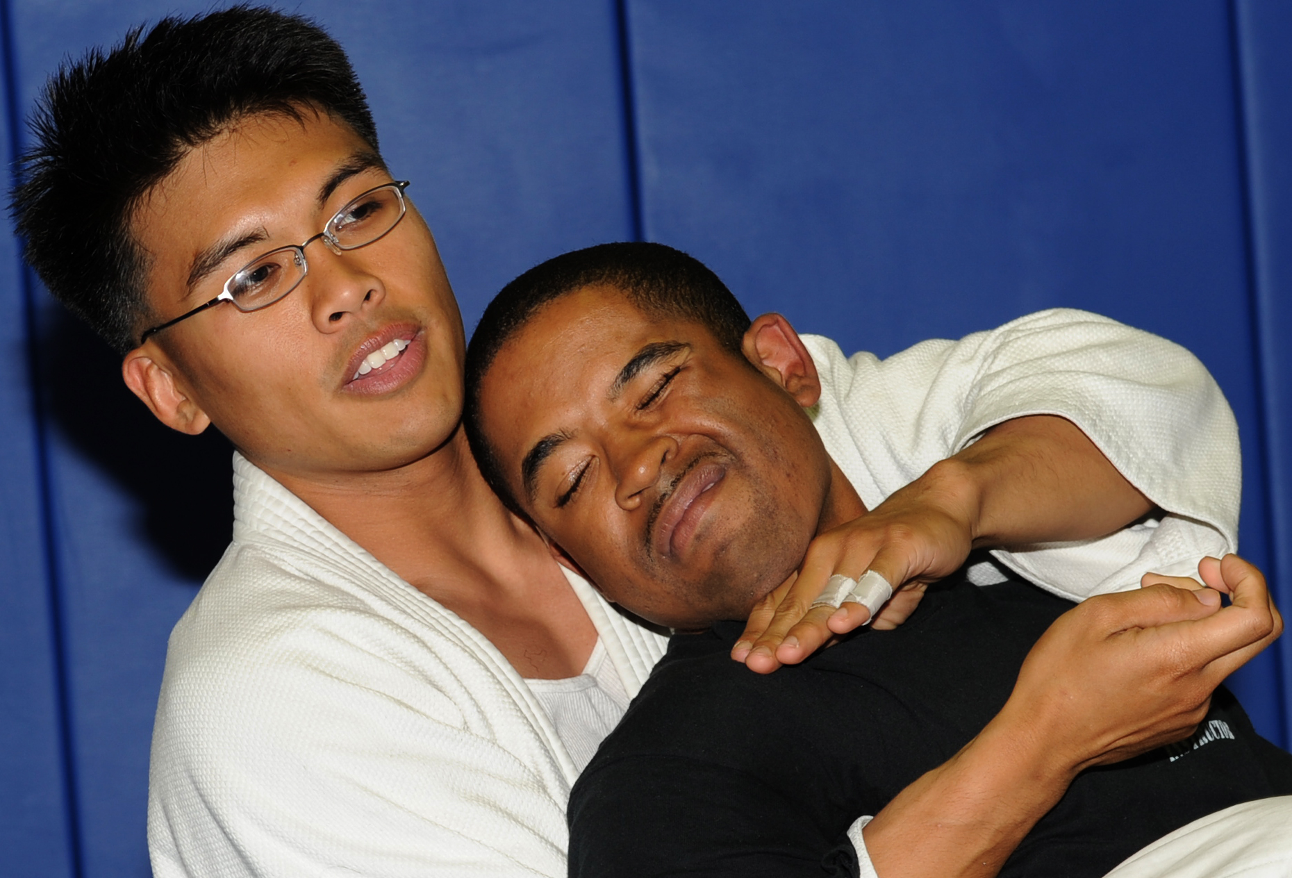 Staff Sgt. Christopher Costa, jiu jitsu instructor, demonstrates a defensive move on Staff Sgt. Marcellous Register, 440th Supply Chain Operations Squadron personnelist at Langley Air Force Base, Va., May 11, 2011. The Jiu Jitsu demonstration ias one of various activities being held during May Fitness Month. (U.S. Air Force photo/Airman 1st Class Teresa Zimmerman)(RELEASED)