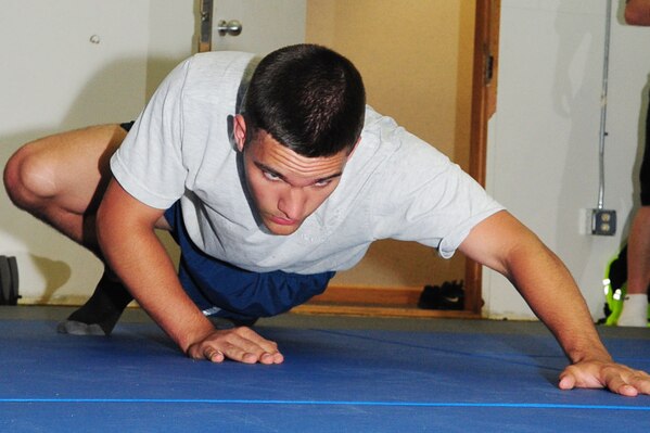 Airman 1st Class Logan Malaney, 10th Intelligence Squadron transmissions technician, stretches before participating in the jiu jitsu demonstration at Langley Air Force Base, Va., May 11, 2011. The demonstration was held to promote May Fitness Month as well as give all military the opportunity to experience the class before signing up. (U.S. Air Force photo by Staff Sgt. Ashley Hawkins)(RELEASED)