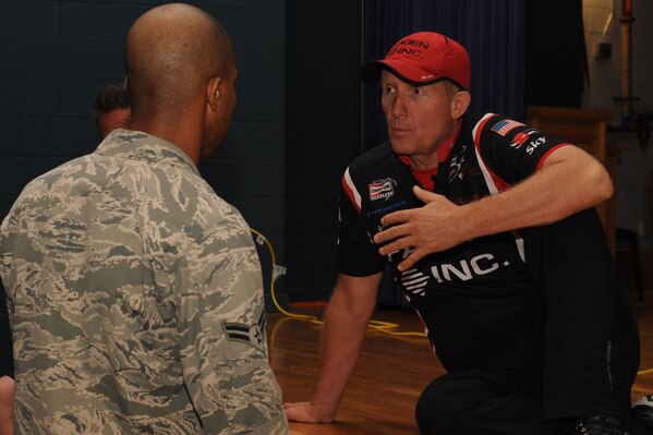 Greg Poe, pilot and motivational speaker, chats with an Airman following his “Elevate Your Life” presentation at the base theater at Langley Air Force Base, Va., May 11, 2011. Poe will perform at AirPower over Hampton Roads May 13-15 with an aerial acrobatics demonstration in his ethanol-powered Fagen MX-2 aircraft. (U.S. Air Force photo by Airman 1st Class Racheal Watson/RELEASED)