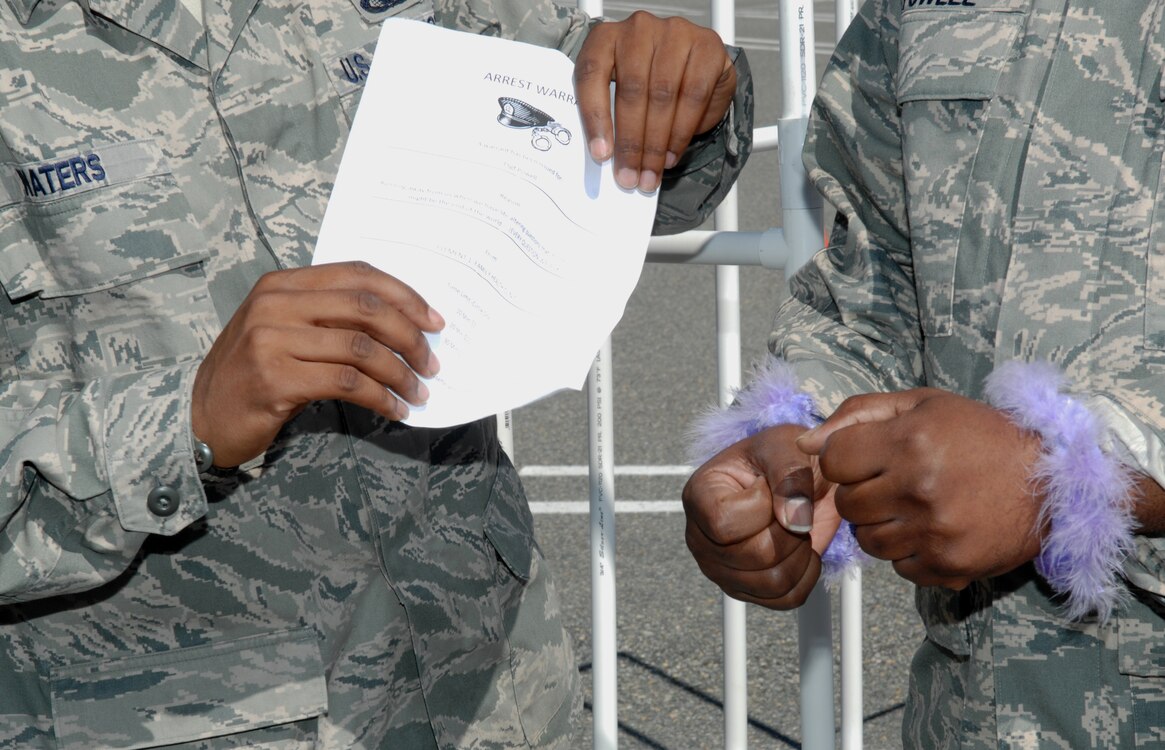 Staff Sgt. Lamar Waters, 633d Security Forces Squadron physical security, serves Tech. Sgt. Reginald Powell, 633d Medical Group Family Health Center noncommissioned officer-in-charge, with a mock arrest warrant during the Jail and Bail fundraiser at Langley Air Force Base, Va., April 29, 2011. The 633 SFS sponsored the event as a fun way to contribute to the Air Force Assistance Fund. (U.S. Air Force photo by Staff Sgt. Jeff Nevison/Released)