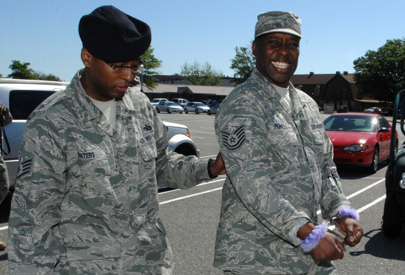 Staff Sgt. Lamar Waters, 633d Security Forces Squadron physical security, arrests Tech. Sgt. Reginald Powell, 633d Medical Group Family Health Center non-commissioned officer-in-charge, during a Jail and Bail Air Force Assistance Fund fundraiser Friday at Langley Air Force Base, Va., April 29, 2011. Langley Airmen issued warrants having friends, coworkers and leadership arrested by security forces and put in mock jail cells at the Base Exchange. (U.S. Air Force photo by Staff Sgt. Jeff Nevison/Released)