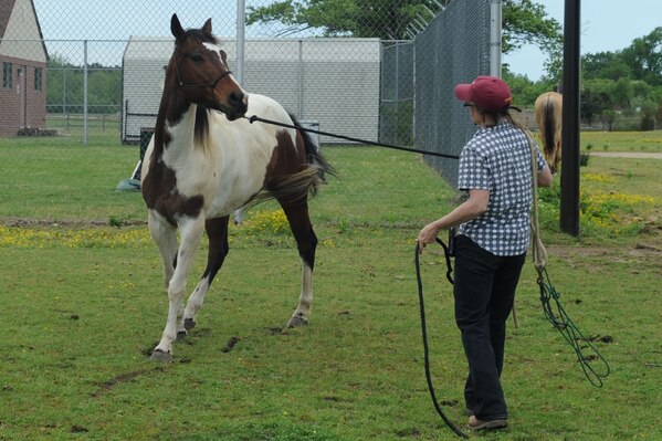 Christy Rew, wife of Lt. Gen. William Rew, Air Combat Command vice commander, leads Brewser across the pasture at the Langley Air Force Base, Va. stable, April 26, 2011. The stable provides shelter for approximately 20 horses with a limit of two horses per family. (U.S. Air Force photo by Airman 1st Class Racheal Watson/RELEASED)