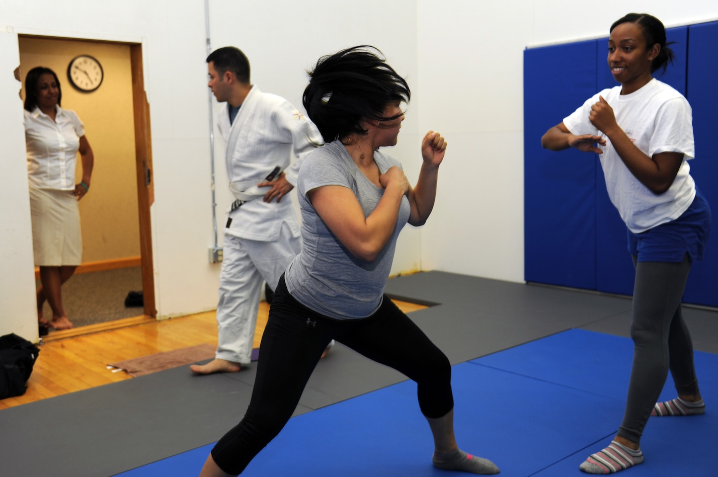 Airman Maria Atahualpa and Airman 1st Class Brianna Garrett 633 Logistiic Readiness Squadron receiving apprentices, practice a self-defense move during a personal safety class at Langley Air Force Base, Va., April 20, 2011. Joint Base Langley-Eustis is observing Sexual Assault Prevention Month throughout April with a variety of seminars, demonstrations and classes to increase awareness of sexual assault and honor survivors. (U.S. Air Force photo by Airman 1st Class Camilla Elizeu/Released)