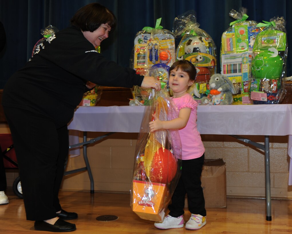 Hope Ballesteros, three year old daughter of Staff Sgt Mary Ballesteros, 633d Comptroller Squadron budget analyst, receives a prize for finding a special Easter egg during the Month of the Military Child Extravaganza at Langley Air Force Base, Va., April 16, 2011. Children who found an egg with a number inside received an Easter basket of their choice. (U.S. Air Force photo/Airman 1st Class Teresa Zimmerman/Released)