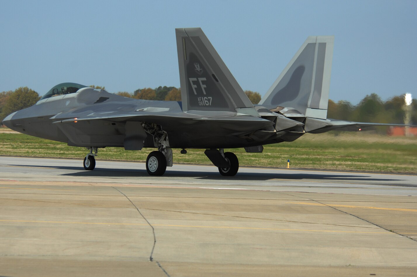 Lt. Col. Bryan Salmon, 149th Fighter Squadron, taxis an F-22 Raptor to the runway during an Operational Readiness Inspection at Langley Air Force Base, Va., April 10, 2011. The inspection evaluates an installation’s ability to efficiently deploy military members, cargo and equipment while adjusting to rapidly changing security conditions. (U.S. Air Force Photo/Airman 1st Class Teresa Zimmerman/Released)
