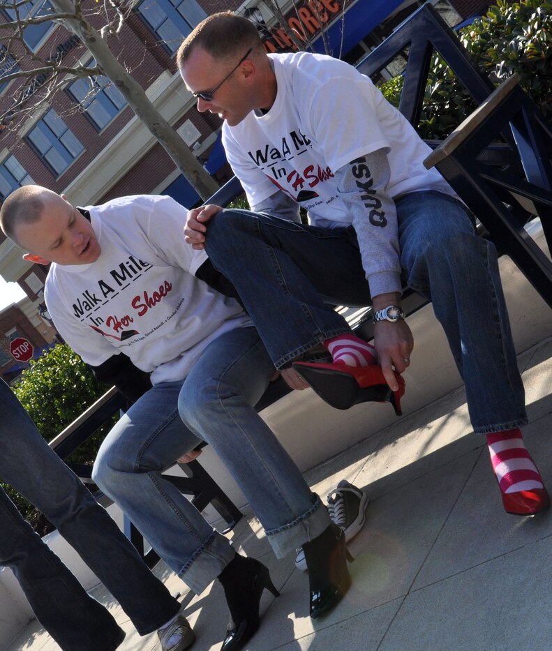 Staff Sgt. Garrett Eckert, 633d Communications Squadron network integration craftsman, watches as Tech. Sgt. Greg Styer, 633d CS network integration noncommissioned officer in charge, puts on his shoes before participating in Walk a Mile in Her Shoes in Hampton, Va., April 2, 2011. The annual march is a “fun way for men to show their support in the fight to end sexual violence” during Sexual Assault Awareness month. (U.S. Air Force Photo/Tech. Sgt. Christina M. Styer/RELEASED)