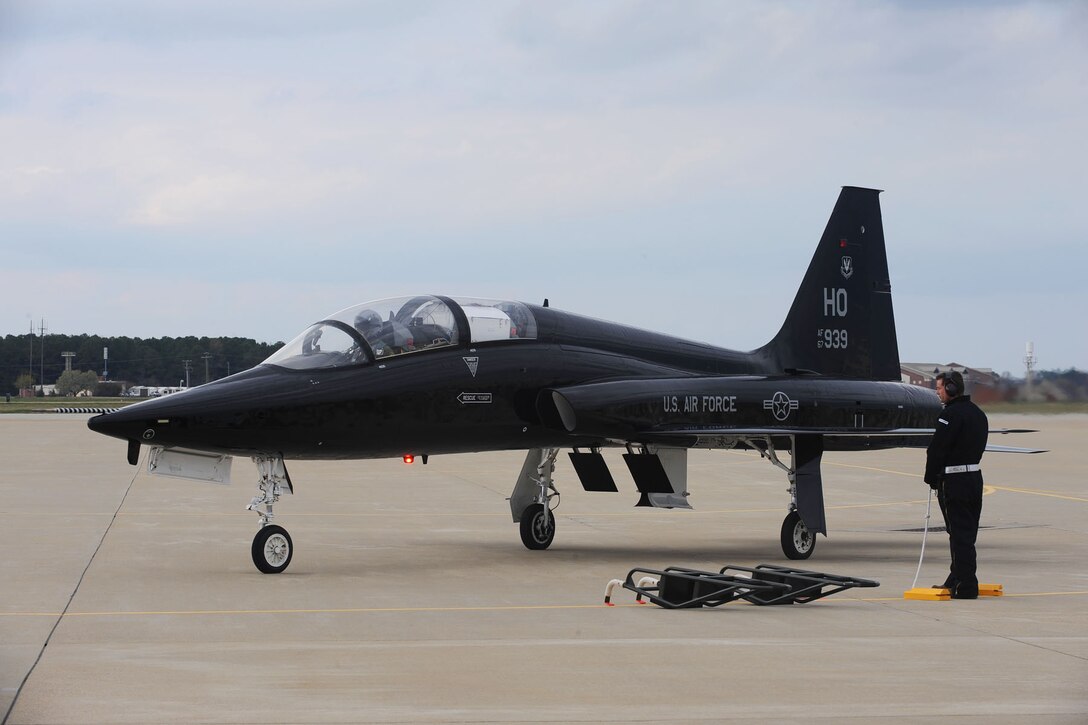 LANGLEY AIR FORCE BASE, Va. -- Col. Kevin Mastin, 1st Fighter Wing vice commander, arrives at Langley Air Force Base, Va., April 1, 2011, in a T-38 Talon. The T-38, from Holloman AFB, N.M., is on a temporary duty assignment to support the F-22 Raptors and provide hands-on combat readiness training for 1st FW pilots. (U.S. Air Force photo/Staff Sgt. Ashley Hawkins)