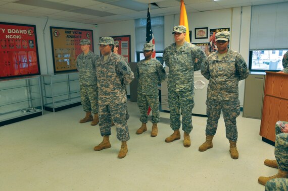 Soldiers of the 510th HRC, one of the most deployed units in the Army, take part in the deployment ceremony prior to their leaving for Afghanistan. The team of six, led by team leader Staff Sgt. Sandra Shakir, deployed in support of Operation Enduring Freedom.