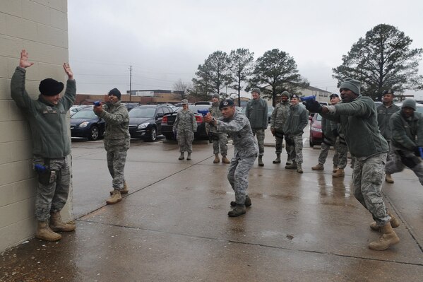 LANGLEY AIR FORCE BASE, Va. -- Airmen with the 633d Security Forces Squadron practice maneuvering tactics during the active shooter portion of training at the SFS building Jan. 26. Security Forces consolidated a year-long on-the-job training into a month-long battery of required tasks to minimize the impact on day-to-day operations. (U.S. Air Force photo/Staff Sgt. Ashley Hawkins)(RELEASED)