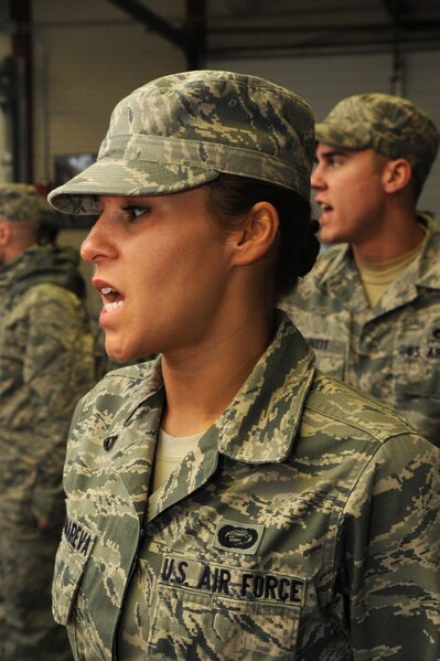 LANGLEY AIR FORCE BASE, Va. – Airman 1st Class Snezhana Ponomareua, 633d Force Support Squadron outbound assignment personnelist, falls out of honor guard formation Dec. 7. Langley honor guard practices daily, carrying the mission of representing Airmen to the American public and the world. (U.S. Air Force photo/Airman 1st Class Racheal Watson)(RELEASED)