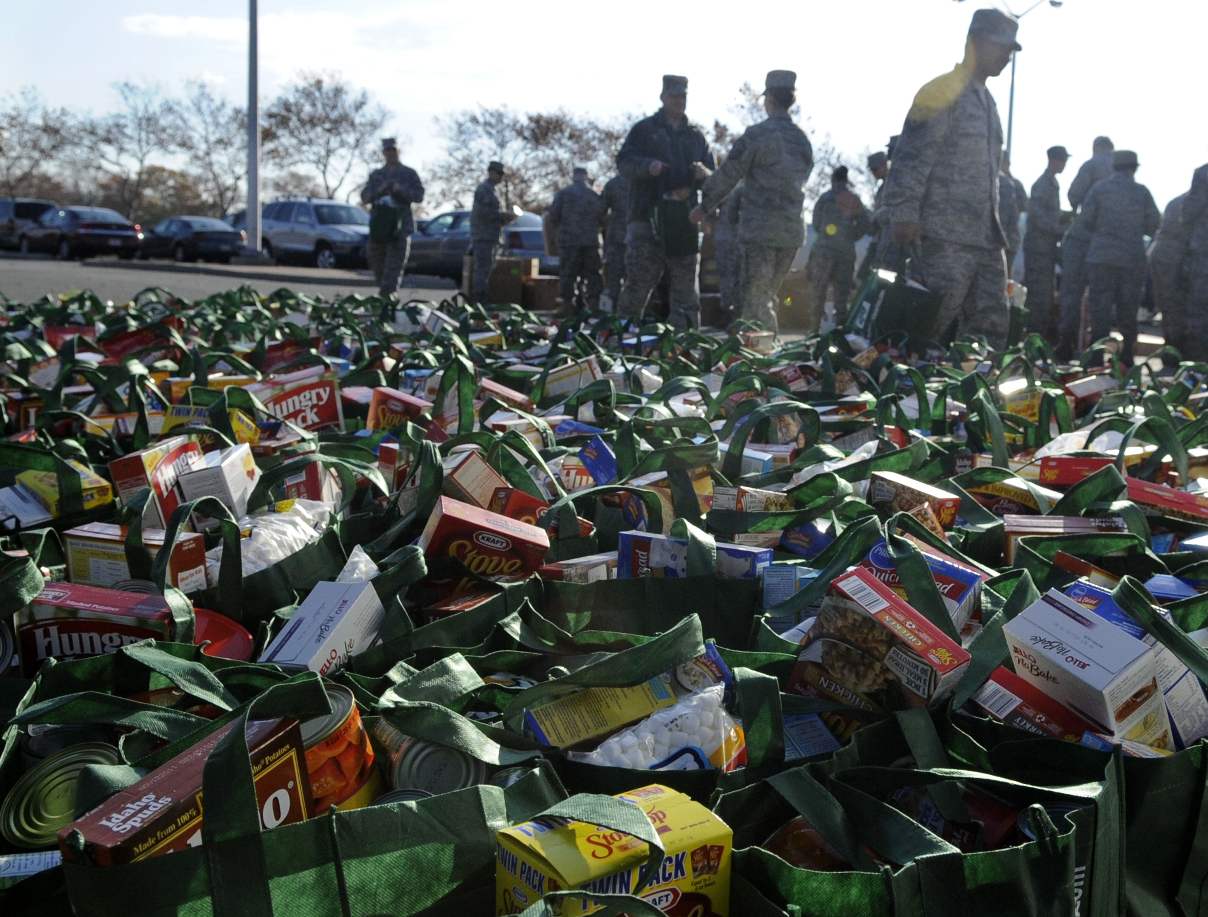 LANGLEY AIR FORCE BASE, Va. – Full bags of groceries sit in the commissary parking lot during the Operation Warm Heart basket build, Nov. 23. Operation Warm Heart receives, manages and distributes charitable funds to Langley Air Force Base families. This year’s basket build up directly contributed more than 400 baskets of complete Thanksgiving meals for Airmen and their families that could use help during the holidays. (U.S. Air Force photo/Staff Sgt. Dana Hill) (RELEASED)