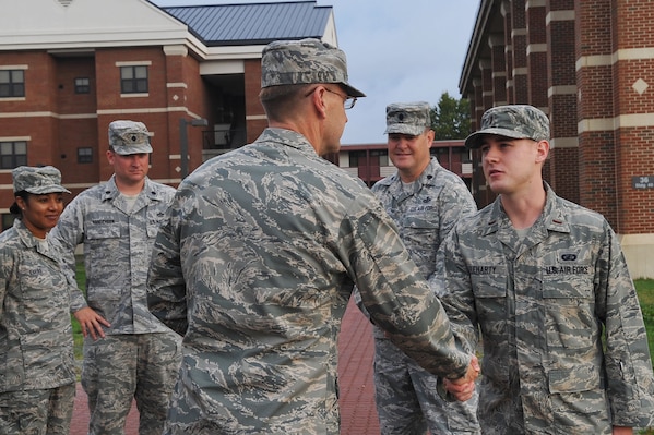 LANGLEY AIR FORCE BASE, Va. -- Maj. Gen. Stephen L. Hoog, 9th Air Force, commander, coins 2nd Lt. Matthew Fleharty, 633d Air Base Wing Contracting Squadron contracting manager, for his contributions to the new dorms while visiting the base Oct. 26. General Hoog toured the entire base, as well as Fort Eustis, to gain greater knowledge on the Airmen, Soldiers and improvement projects across both installations. (U.S. Air Force photo/Staff Sgt. Ashley Hawkins)(RELEASED)