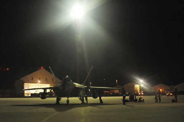 LANGLEY AIR FORCE BASE, Va -- Lt. Col. Peter Fesler, 1 Fighter Wing, 27 Fighter Squadron commander, taxis the aircraft, while his family waits to greet him upon his return from Guam. A team of eight pilots from the 27th FS were deployed for four months in support of operations in the Pacific. (U.S. Air Force photo/Staff Sgt. Ashley Hawkins)(RELEASED)