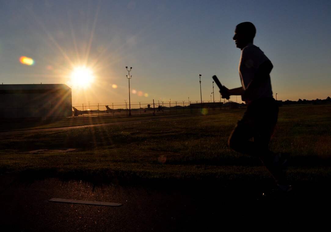 LANGLEY AIR FORCE BASE, Va – Airman 1st Class Steven Brennan, 439th Supply Chain Operation Squadron team member, takes off at the start of a 9/11 memorial run Sept. 10, 2010. 633d Civil Engineer Squadron hosted the run in memoriam of the 55 military personnel that gave their lives on Sept. 11. Ten teams, each consisting of 11 people, ran a total of 550 miles with each member running a five-mile loop. (U.S. Air Force photo/Senior Airman Jonathan Muller)(RELEASED)