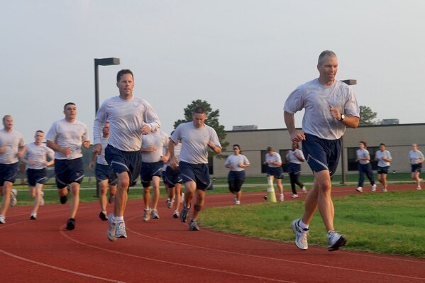 LANGLEY AIR FORCE BASE, Va -- Air Combat Command Chief Master Sgt. Martin Klukas runs a lap during physical training with the 633d Air Base Wing staff Aug. 10. Chief Klukas toured the base Aug. 9 and 10, interacting with the Airmen of all squadrons to better understand their work force and needs. (U.S. Air Force photo/Staff Sgt. Ashley Hawkins)(RELEASED)