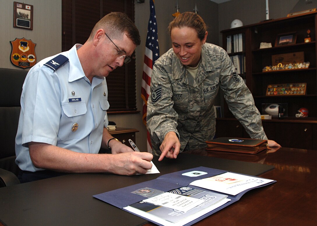 LANGLEY AFB, VA.--Col. Donald Kirkland, 633d Air Base Wing commander, signs the Air Force Sergeants’ Association membership form with the help of Tech. Sgt. Beverly Lutz, president of AFSA Chapter 358. The AFSA is a federally chartered, non-profit organization representing the professional and personal interests of active duty and retired enlisted members of the Air Force. Colonel Kirkland said he was honored to be asked to be part of the organization.