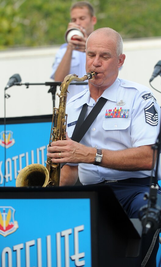 Williamsburg, Va. --Master Sgt. Allen Wittig, Langley Air Force Base Heritage of America band, plays the saxophone at the Merchants Square during the Satellite Jazz Ensemble, Aug. 4. The band is scheduled to perform free concerts at the Merchants Square in Williamsburg every Wednesday in the month of August, starting at 7 p.m. (U.S. Air Force photo/Senior Airman Gul Crockett)