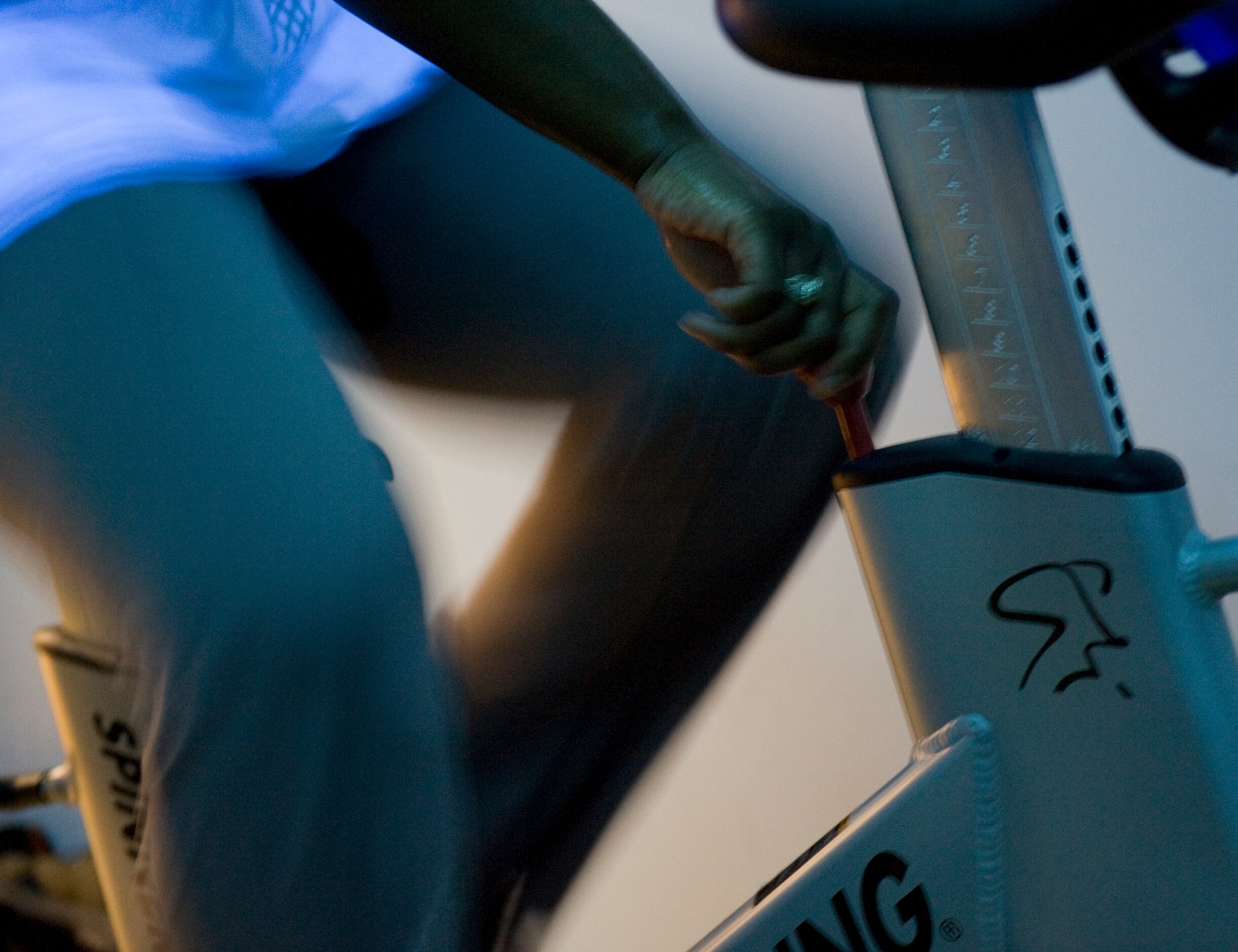 LANGLEY AIR FORCE BASE, Va. -- Sgt. Christine Johnson, 15th Intelligence Squadron intelligence analyst,increases her resistance during the 2010 Spinathon at the Shellbank Fitness Center May 22. The event was held as part of Fitness Month and members who completed a minimum of two hours received a T-shirt. (U.S. Air Force photo/Senior Airman Zachary Wolf)