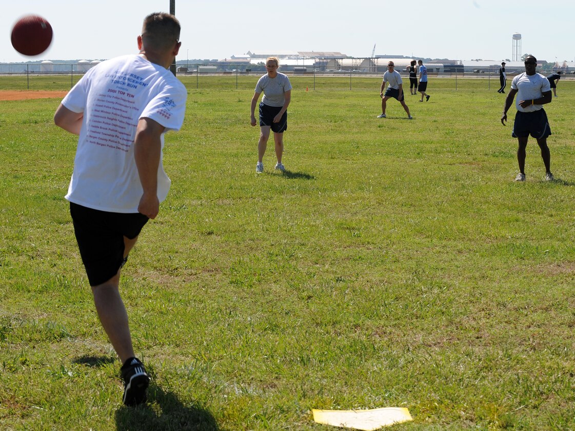 LANGLEY AIR FORCE BASE, Va. -- Master Sgt. Steve Mathews, 1st Operations Group first sergeant, kicks the ball as members of the 633d Security Forces Squadron play defense during a kickball tournament May 21. The tournament was held as part of Fitness Month, which is designated annually to the month of May, promoting healthier lifestyles for all Langley families by providing various athletic activities. (U.S. Air Force photo/Senior Airman Zachary Wolf)