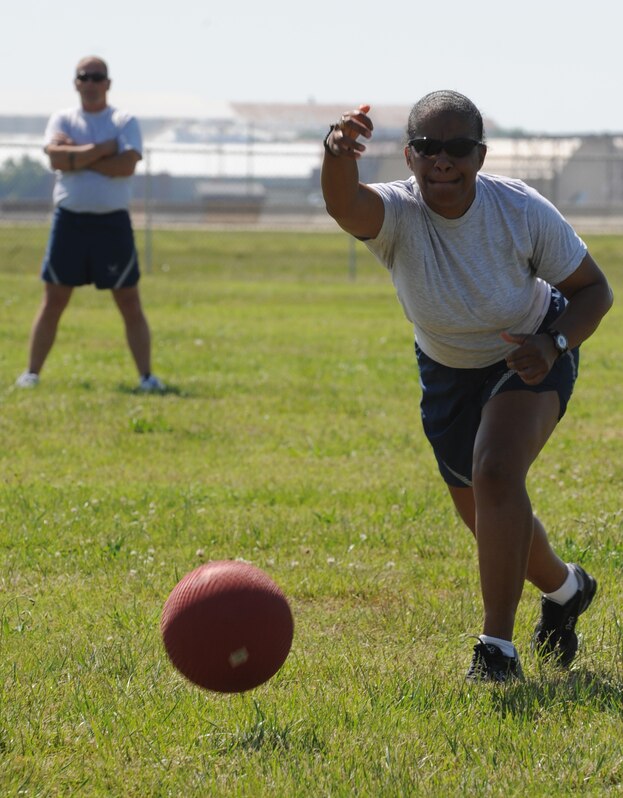 LANGLEY AIR FORCE BASE, Va. -- Chief Master Sgt. Shelina Frey, Air Combat Command first sergeant, rolls the ball, during a kickball tournament May 21. The tournament was held as part of Fitness Month, which is designated annually to the month of May, promoting healthier lifestyles for all Langley families by providing various athletic activities. (U.S. Air Force photo/Senior Airman Zachary Wolf)