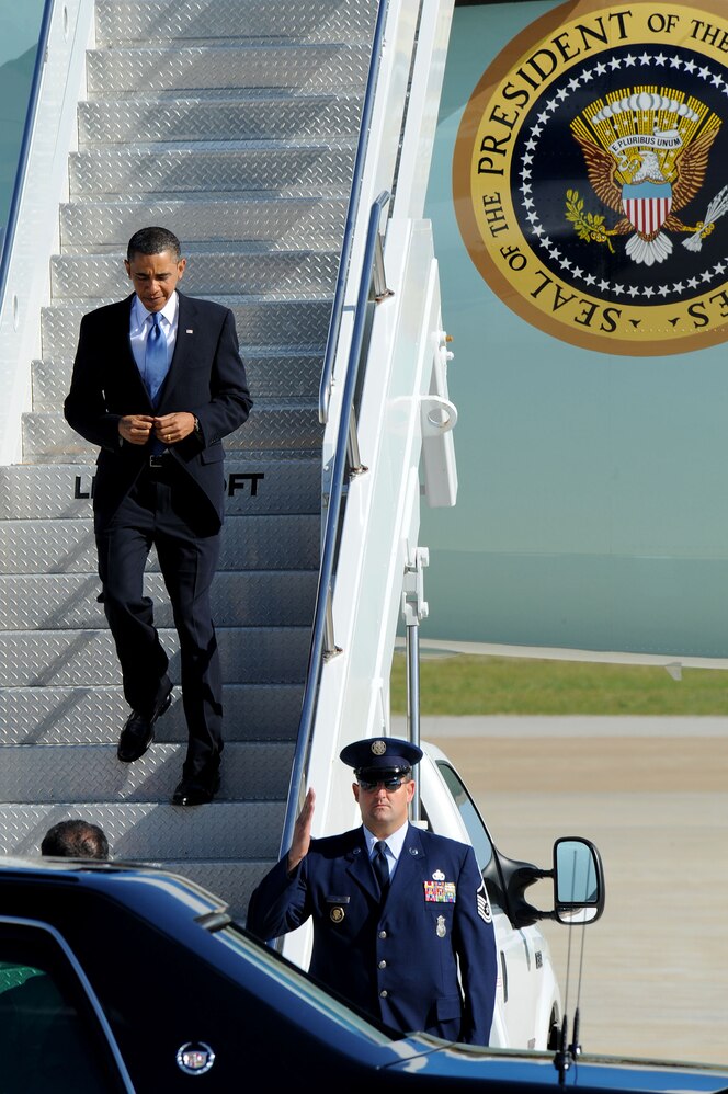 LANGLEY AIR FORCE BASE, Va. -- President Barack Obama disembarks Air Force One May 9. President Obama delivered the commencement address at nearby Hampton University, emphasizing the importance of education and good citizenship to graduates. (U.S. Air Force photo/Staff Sgt. Christina M. Styer)
