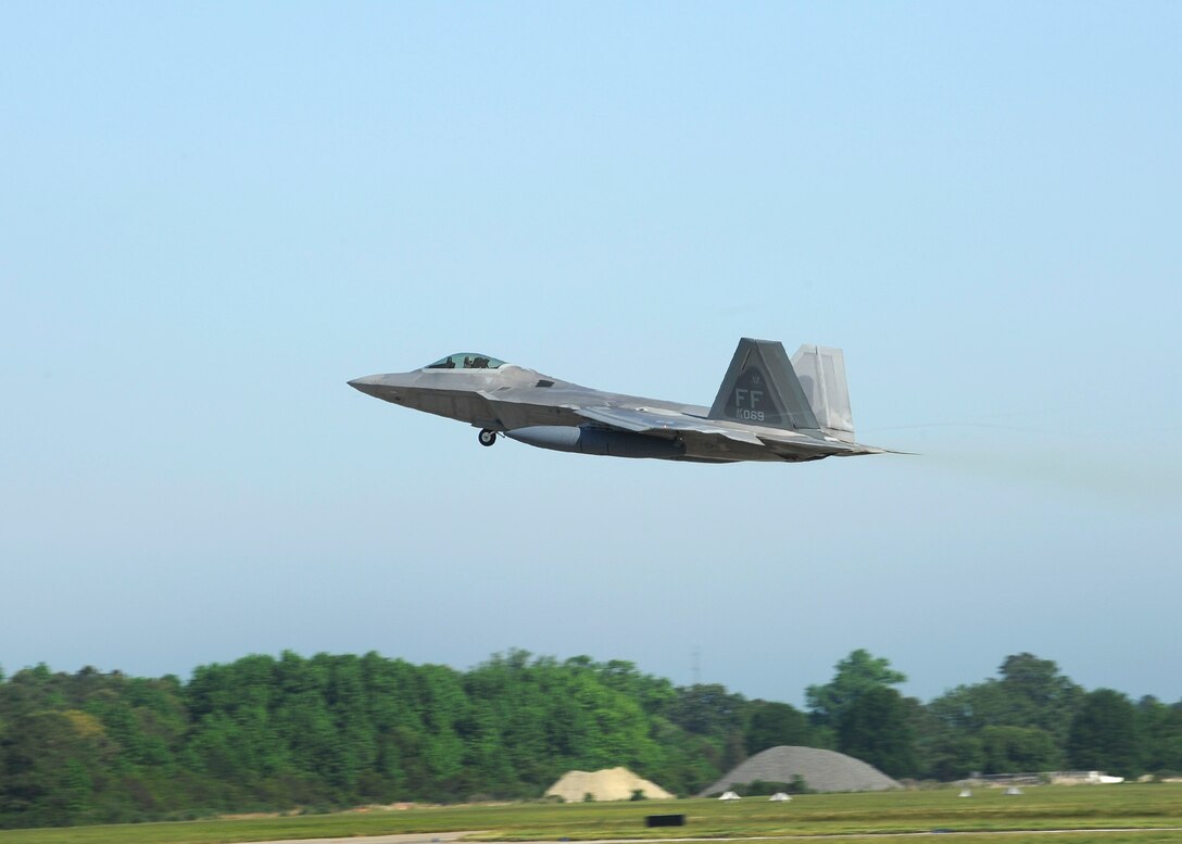 LANGLEY AIR FORCE BASE, Va. - An F-22 Raptor departs for Hill Air Force Base, UT to participate in the Combat Hammer exercise May 1. The exercise will test precision air-to-ground bombing capabilities and prepare air crews for upcoming deployments. (U.S. Air Force photo/Airman 1st Class Gul Crockett)
