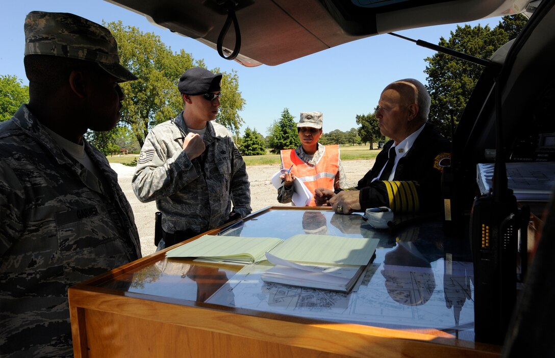 LANGLEY AIR FORCE BASE, Va. – Members of the mobile command post discuss actions to take during a Major Accident Response Exercise April 29. The MARE is Langley's first with a tornado scenario, testing first responders and base personnel’s preparedness and ability to respond to a natural disaster. (U.S. Air Force photo/Senior Airman Dana Hill)