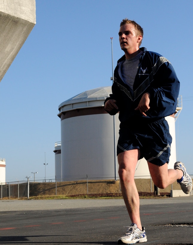 LANGLEY AIR FORCE BASE, Va. - Senior Airman Brandon Bridges, 633d Civil Engineer Squadron, pushes toward the finish line during the Tax Day 10k run April 15. Approximately 60 members signed up for the fun run, which aimed to relieve stress and celebrate the completion of tax season. (U.S. Air Force photo/Senior Airman Dana Hill)