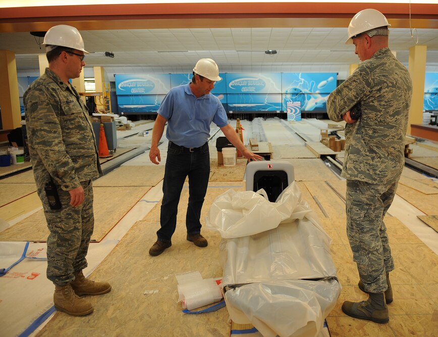 LANGLEY AIR FORCE BASE, Va. -- Joseph Sirois, civil engineer contractor, shows Col. Donald Kirkland, 633d Air Base Wing commander, and Lt. Col. Jeffery Ullmann, 633d Civil Engineer Squadron commander, brand new bowling equipment at Langley Lanes during the Base Civil Engineer Update Project Tour March 7. 633 CES is constructing and improving multiple facilities base-wide. (U.S. Air Force photo/Airman Rebecca Montez)