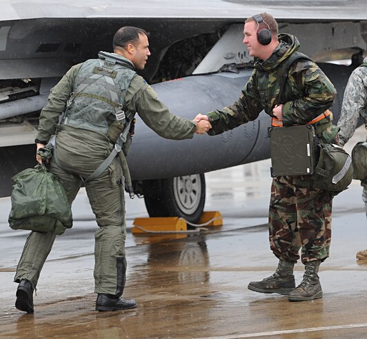 LANGLEY AIR FORCE BASE, Va. -- Lt. Col. Adrian Spain, 94th Fighter Squadron commander, greets his crew during his arrival at "Base X" during a Phase I Operational Readiness Exercise here March 26. This ORE generated more raptors than any previous Phase I ORE at Langley. (U.S. Air Force photo/Airman Rebecca Montez)