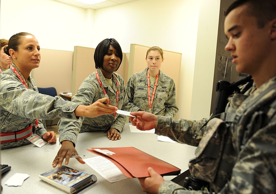 LANGLEY AIR FORCE BASE, Va. -- Airman Kelly Jones, 633d Security Forces Squadron, meets with representatives from the Finance and Legal office as he processes through a personnel deployment function line during a Phase I Operational Readiness Exercise here March 26. Wing Exercise Evaluation Team members will spend two days assessing the ability of the 633d Air Base Wing, 1st Fighter Wing, and 192d Fighter Wing to deploy cargo, aircraft and Airmen within a limited timeframe. (U.S. Air Force photo/Airman Rebecca Montez)