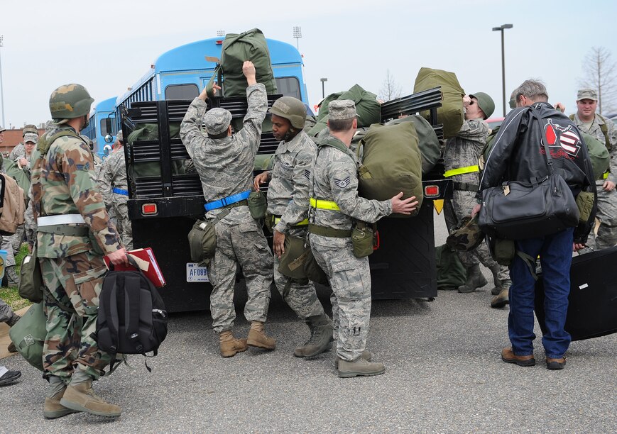 LANGLEY AIR FORCE BASE, Va. -- Airmen from the 633d Air Base Wing, 1st Fighter Wing, and 192d Fighter Wing, load mobility bags as they prepare to process the deployment line during the Phase I Operational Readiness Exercise here March 25. Wing Exercise Evaluation Team members will spend two days assessing the ability of Langley Airmen to deploy cargo, aircraft and Airmen within a limited timeframe. (U.S. Air Force photo/Airman Rebecca Montez)
