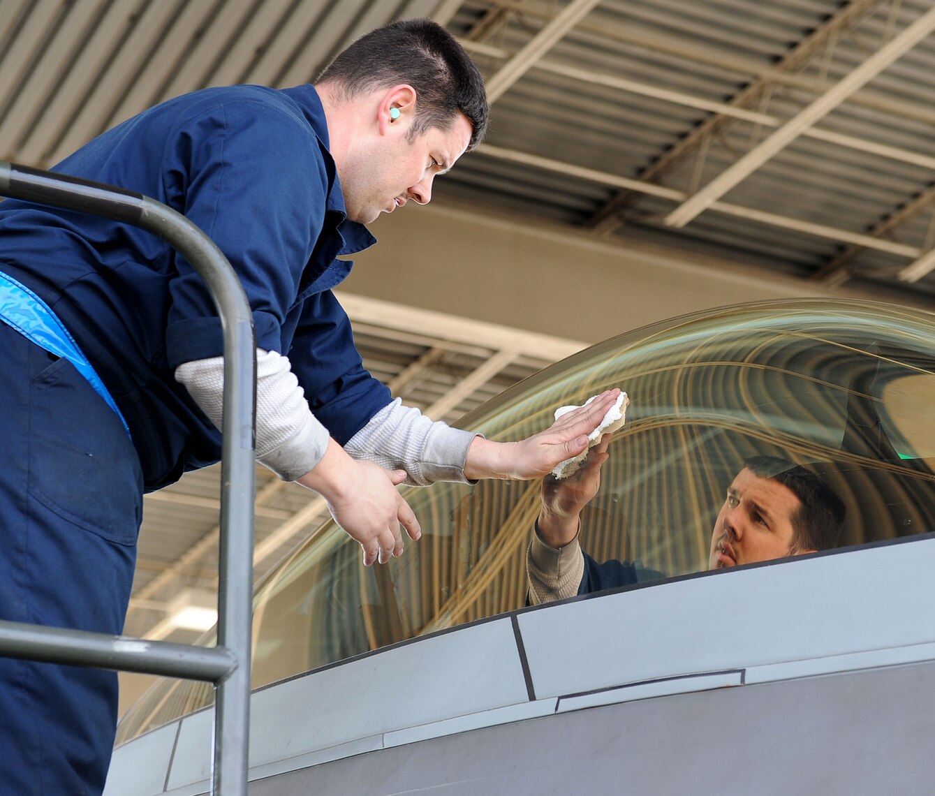 LANGLEY AIR FORCE BASE, Va. -- Staff Sgt. Martin Miller, 94th Aircraft Maintenance Unit crew chief, cleans the canopy of an F-22 Raptor during the Phase I Operational Readiness Exercise here March 25. This ORE generated more raptors than any previous Phase I ORE at Langley. (U.S. Air Force photo/Airman Rebecca Montez)
