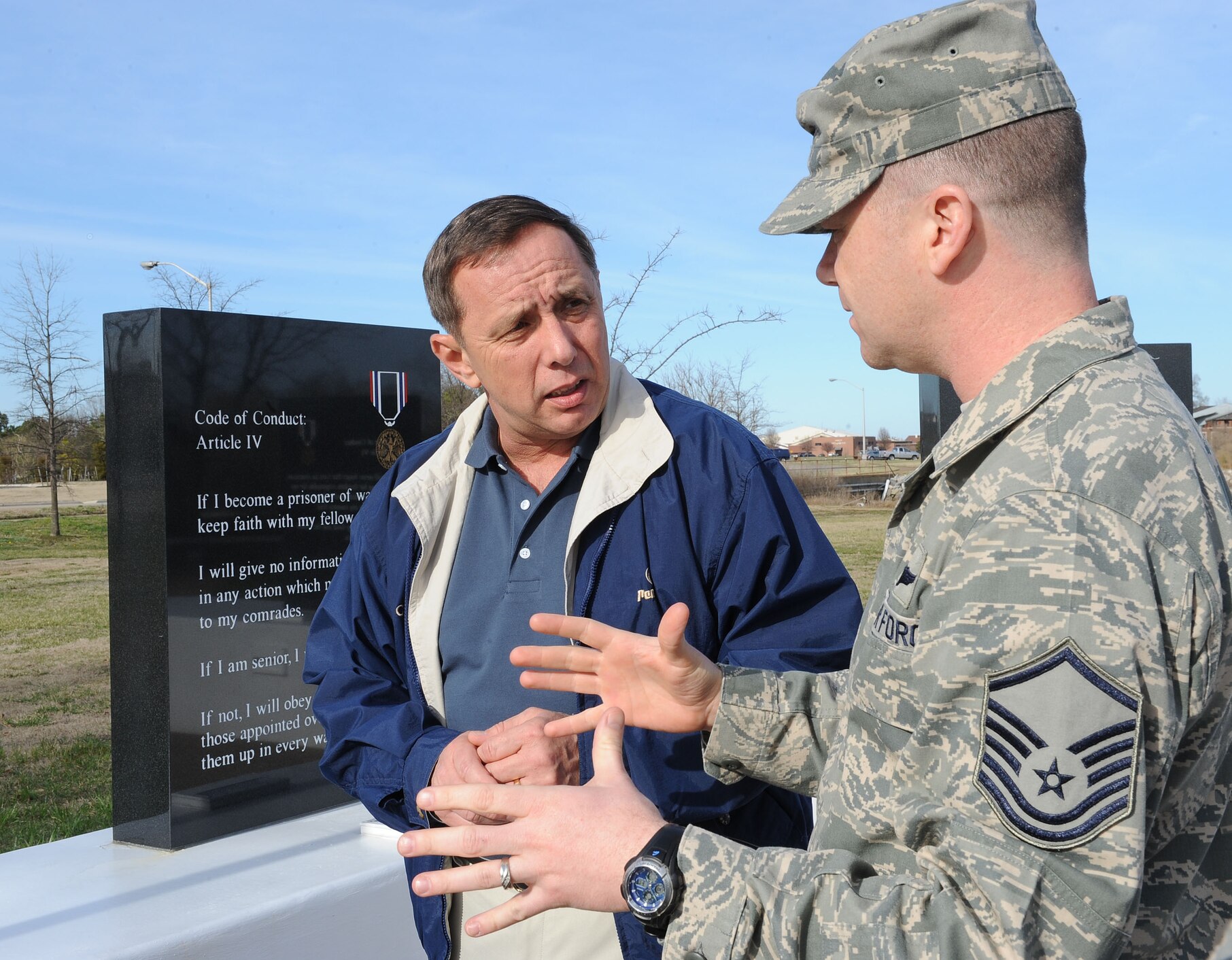 LANGLEY AIR FORCE BASE, Va. -- Master Sgt. Robert Casagrande, Air Force Sergeants Association Chapter 358 president, explains the symbolism of the recently erected Prisoner of War/Missing in Action Memorial to retired Chief Master Sgt. of the Air Force Frederick J. Finch during his tour here, March 17. Chief Finch spent time touring new facilities and interacting with Airmen during his visit. (U.S. Air Force photo/Airman Rebecca Montez)