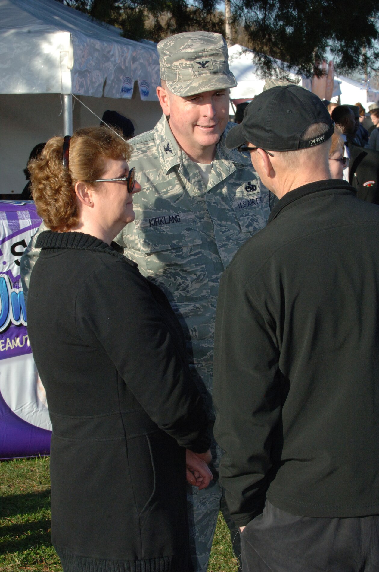 LANGLEY AIR FORCE BASE, Va. – Col. Donald Kirkland, 633d Air Base Wing commander, and his wife, Judy, talk with Richard K. Smucker, J. M. Smucker Company executive chairman and co-CEO, at the Smucker's Mission: Breakfast celebration March 19. Smucker's provided free breakfast to military personnel and their families to reward the Langley Commissary for winning the Mission: Breakfast contest for most unique store display. (U.S. Air Force photo/Airman 1st Class Jason J. Brown)