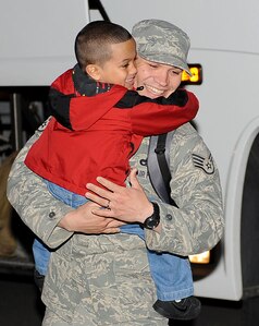 LANGLEY AIR FORCE BASE, Va. -- Staff Sgt. Michael Serrano, 633d Logistics Readiness Squadron vehicle operator, hugs his son, Rome, 5, during his homecoming March 5. Sergeant Serrano and eight others deployed for 200 days as Air Force Combat Convoy Vehicle Operators in support of the 586th Expeditionary Logistics Readiness Squadron at Camp Arifjan, Kuwait. (U.S. Air Force photo/Airman Rebecca Montez)