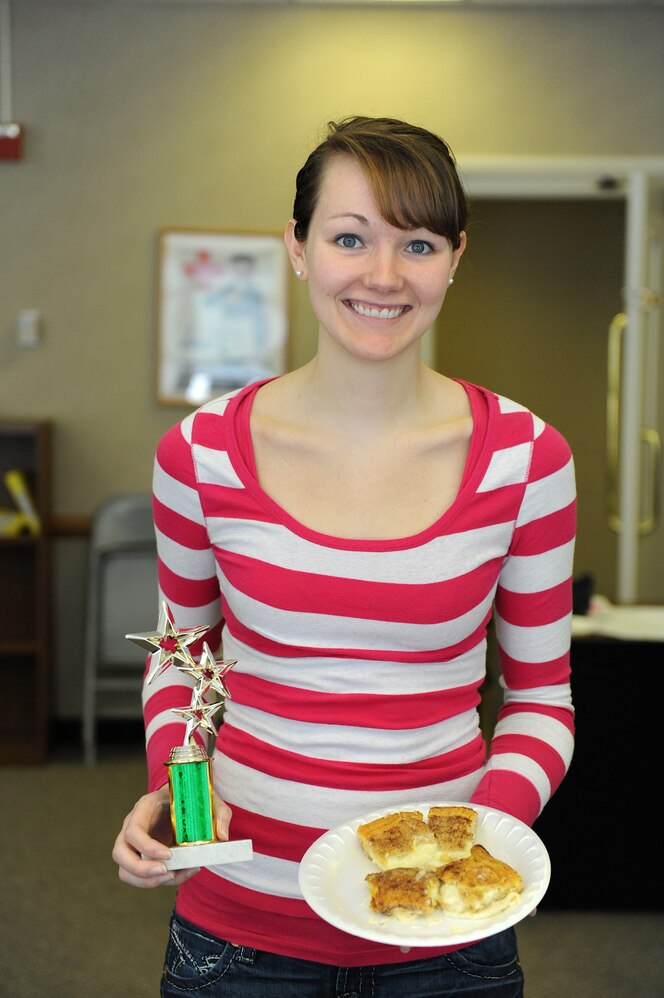 LANGLEY AIR FORCE BASE, Va. -- Airman Bethany Provot, 633d Dental Squadron general dental technician, shows off her first place trophy and winning cinnamon cheesecake after a cook-off March 6. The 633d Force Support Squadron hosted the cook-off at the community center and plans to conduct more cooking contests in the futre. (U.S. Air Force photo/Senior Airman Zachary Wolf)