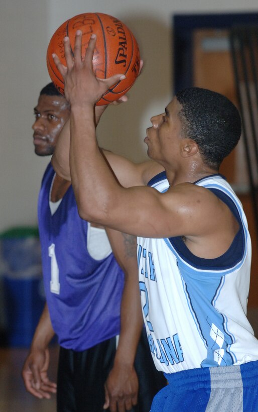 LANGLEY AIR FORCE BASE, Va. -- Air Force Targeting Center Small Forward Drew Colen prepares to shoot a free-throw in an intramural basketball play-off game March 4 at the Shellbank Fitness Center. AFTC won the game, 65-58. (U.S. Air Force photo/Airman 1st Class Jason J. Brown)