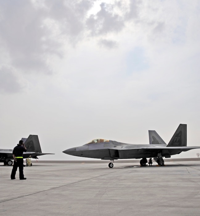 Senior Airman Adam Smith, 1st Fighter Wing crew chief, prepares to marshal an F-22 Raptor Nov. 30, 2009, at an airfield in Southwest Asia. Airman Smith is participating in the Iron Falcon exercise while on temporary duty from Langley Air Force Base, Va. Airman Smith is from Boston. (U.S. Air Force photo/Tech. Sgt. Charles Larkin Sr)