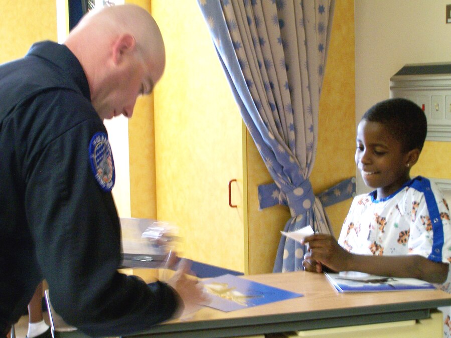 Master Sgt. Tim Green, F-22 Raptor demonstration team superintendent, signs lithographs for patients at La Rabida Children's Hospital in Chicago Aug. 15. (U.S. Air Force photo/Capt. Rob Lazaro)