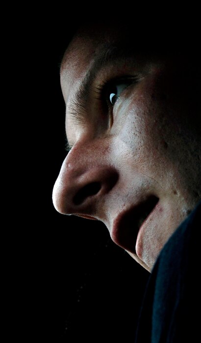 Watching for incoming danger, 2nd Lt. Timothy Jastrab peers through a hole in a wall Aug. 9 during expeditionary combat skills training at Langley Air Force Base, Va. The training course is designed to give Air Force members skills in non-traditional combat career fields. (U.S. Air Force photo/Airman 1st Class Vernon Young.)