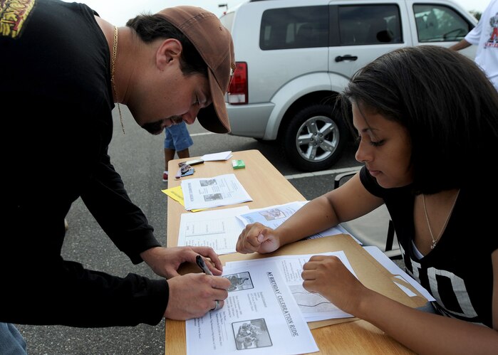 LANGLEY AIR FORCE BASE, Va. -- Kevin Duvall, motorist, signs in with Senior Airman Raquel Rivera, 1st Security Forces Squadron, before the Langley's first Air Force Birthday Motorcycle Ride here Sept. 16. All proceeds from the ride were donated to Operation Warm Heart, a year-round program designed to assist Airmen and their families. (U.S. Air Force photo/Airman Rebecca Montez)