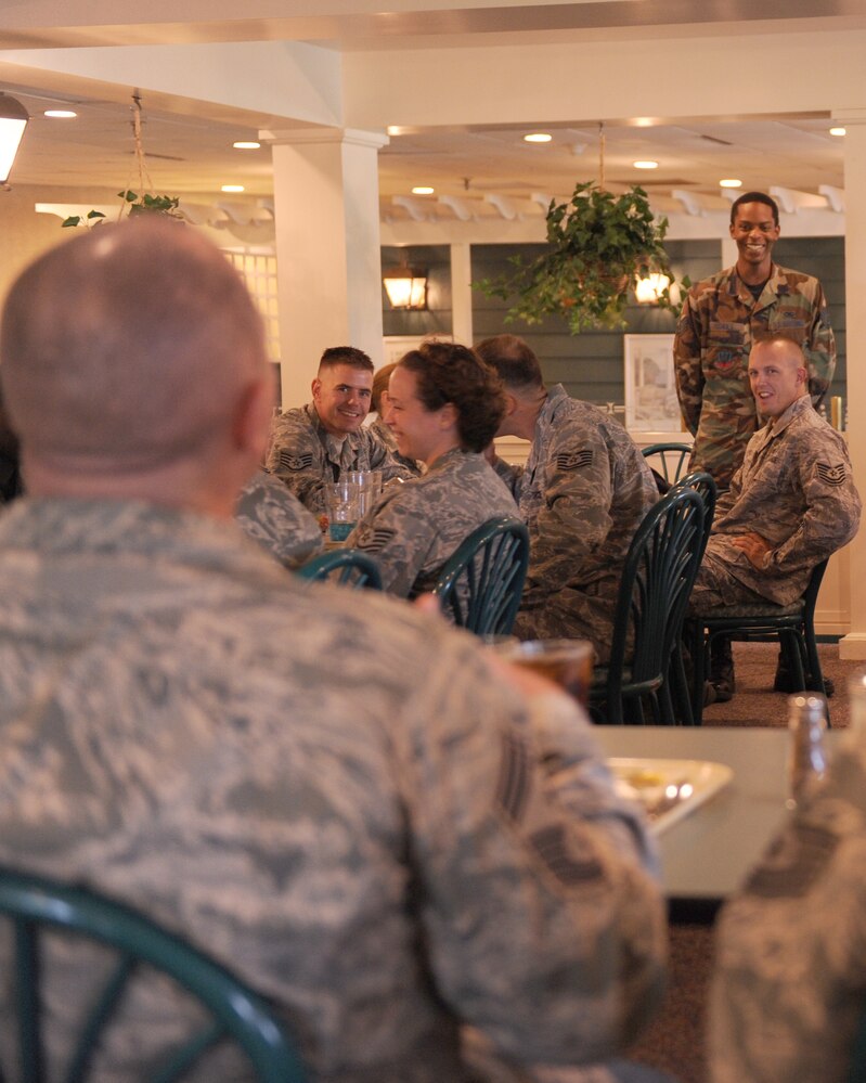 LANGLEY AIR FORCE BASE, Va. -- Staff Sgt. Marquis Echols, Aircraft Maintenance Squadron weapons section, answers a question Chief Master Sgt. Scott Dearduff, command chief for the 9th Air Force and U.S. Air Forces Central Command, asked him during a luncheon held for Chief Dearduff to get to know the Airmen better here Sept.11. Chief Dearduff visited with Airmen and toured some of Langley's squadrons after attending the Air Combat Command change-of-command Sept. 10. (U.S. Air Force photo/Airman1st Class Jonathan Koob)
